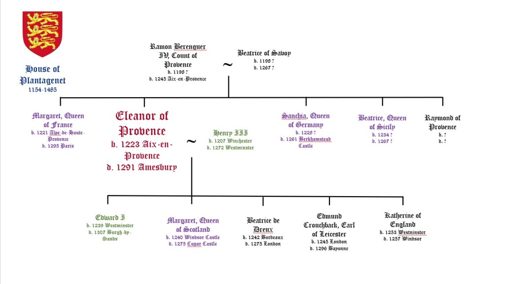 • August: Eleanor’s father Raymond Berengar dies. He leaves the whole county of Provence, as well as some lands that were only on loan from Henry, to his youngest daughter Beatrice, who marries Charles of Anjou, brother to King Louis IX of France. Raymond leaves £6,667 in dowry to both Eleanor and her sister Marguerite but Charles refuses to pay it. Henry hears the news of his death first, and keeps the news from Eleanor until he can return from Wales and tell her himself [3, 16, 23]